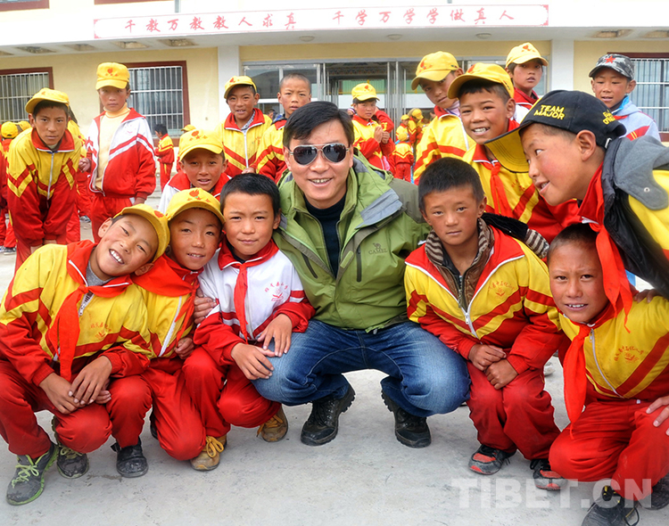 這是王飛在看望中國石化班戈縣小學(xué)的藏族孩子時(shí)合影留念(唐召明提供,2013年8月30日攝)