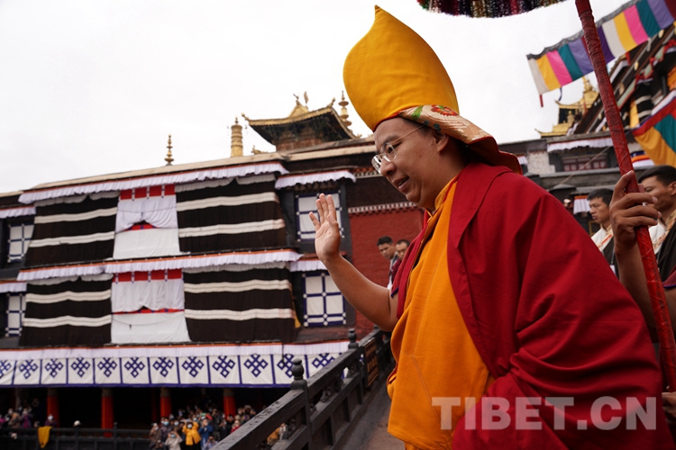 班禪抵達(dá),現(xiàn)場(chǎng)桑煙繚繞,法號(hào)聲悠長(zhǎng),扎什倫布寺僧眾以藏傳佛教最高禮儀迎接班禪?,F(xiàn)場(chǎng)等候班禪的信教群眾紛紛摘帽行禮或雙手合十,向班禪的到來(lái)表示熱烈歡迎,班禪見(jiàn)狀揮手致意、送上祝福。隨后,班禪在手持黃傘、香爐的高僧引領(lǐng)下緩緩步行至措欽大殿。