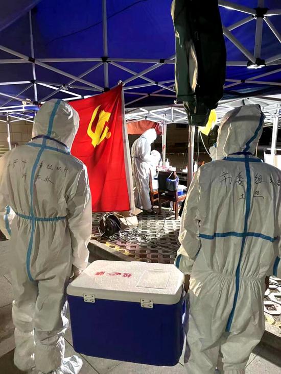 圖為黨旗飄揚(yáng)在核酸檢測點上攝影:普瓊
