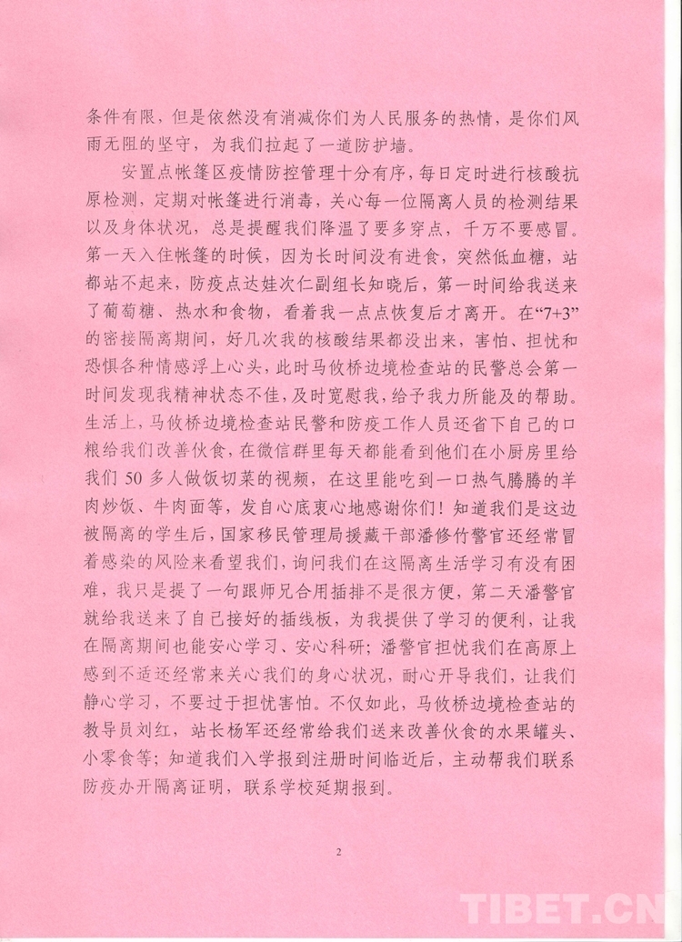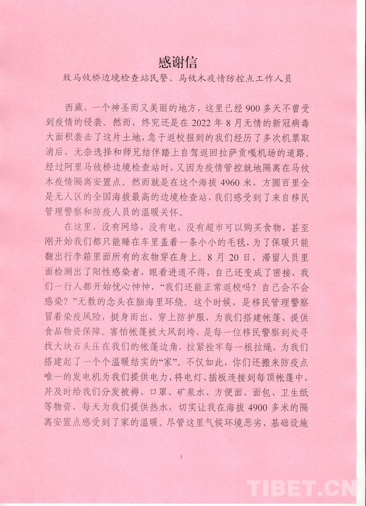 中國(guó)西藏網(wǎng)訊 “感謝逆流而上的你們!盡管有些人未曾謀面,我也看不到你們疲憊的面容,但在我心中,馬攸橋邊境檢查站移民管理警察,就是我在西藏的親人們,是我們眼中的大英雄們!”這段感人肺腑的言語來自西藏出入境邊防檢查總站阿里邊境管理支隊(duì)馬攸橋邊境檢查站臨時(shí)安置點(diǎn)馬攸木2名博士的一封感謝信。