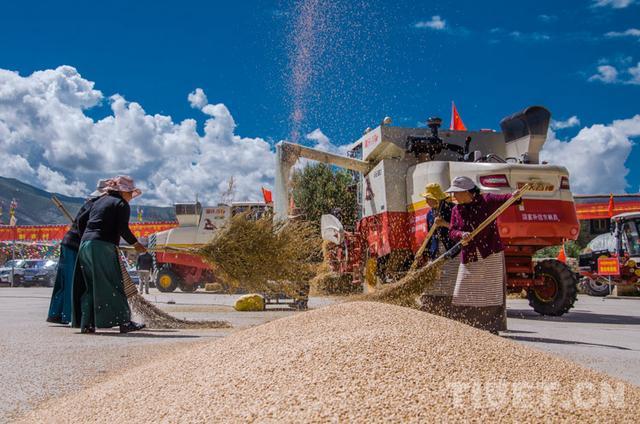 圖為2019年9月6日,2019?西藏“中國(guó)農(nóng)民豐收節(jié)”暨扎囊縣氆氌文化節(jié)期間,西藏自治區(qū)山南市扎囊縣羊噶居委會(huì)機(jī)械化打麥現(xiàn)場(chǎng) 攝影:趙耀