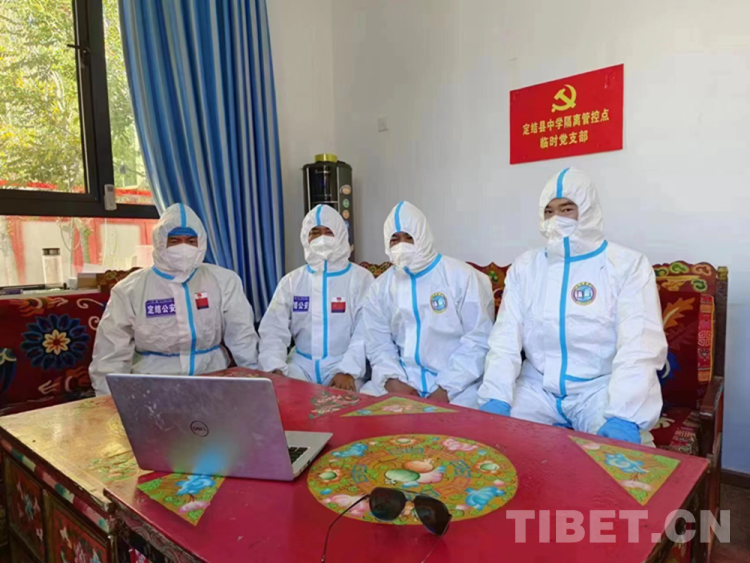 圖為10月16日上午,西藏自治區(qū)日喀則市定結(jié)縣中學(xué)隔離管控點一線“戰(zhàn)”疫工作人員收看黨的二十大開幕會直播