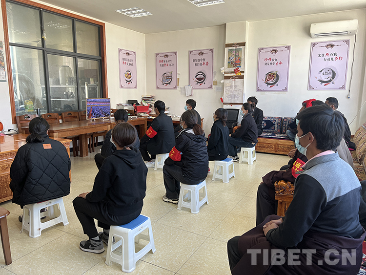圖為西藏自治區(qū)拉薩市堆龍德慶區(qū)德慶鎮(zhèn)門堆村村“兩委”、駐村工作隊(duì)等觀看黨的二十大開幕會 攝影:鮑存根