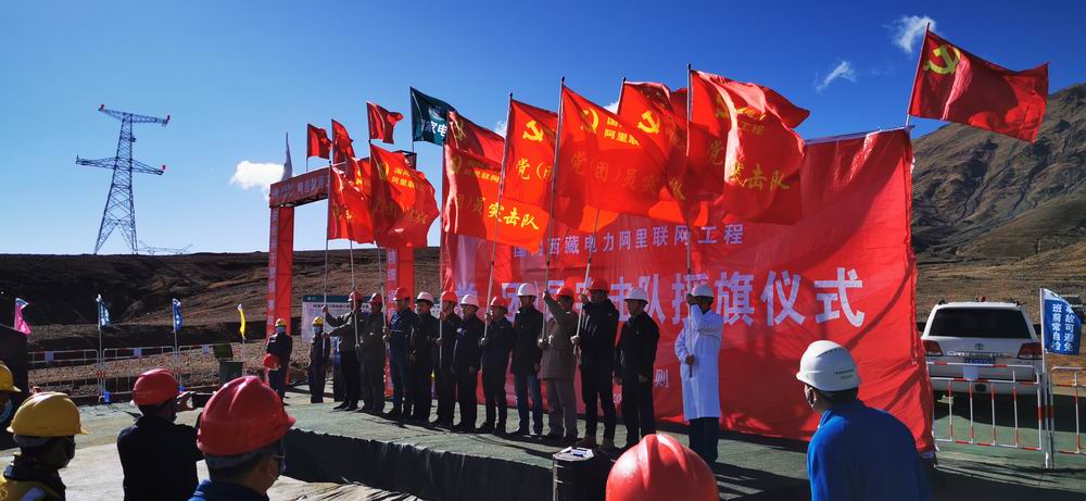 圖為在國網(wǎng)西藏電力阿里聯(lián)網(wǎng)工程黨、團員突擊隊授旗儀式上,工程建設者們在世界屋脊高擎旗幟