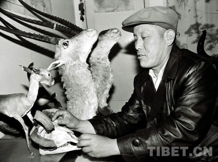 這是洛桑丹珍在他的家庭博物館里整理所收藏的動物標本(唐召明1998年攝)