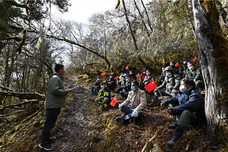 圖為在休息間隙圖索朗頓珠為護(hù)邊員宣講黨的二十大精神