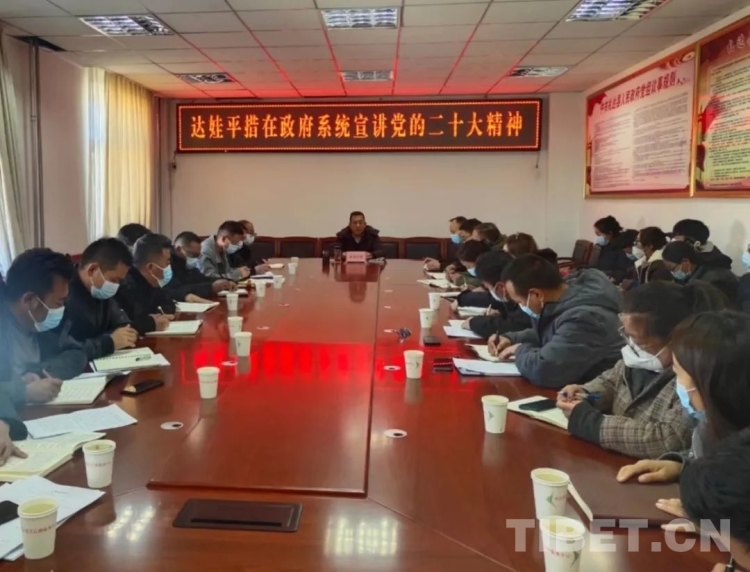 圖為達娃平措為札達縣政府系統(tǒng)干部宣講黨的二十大精神
