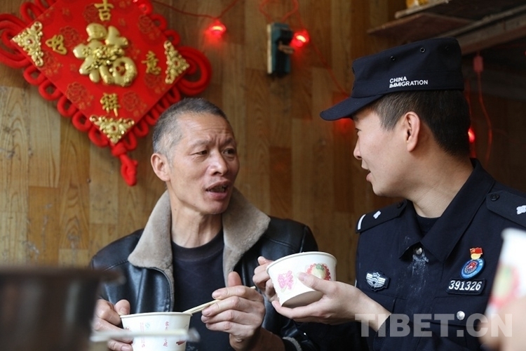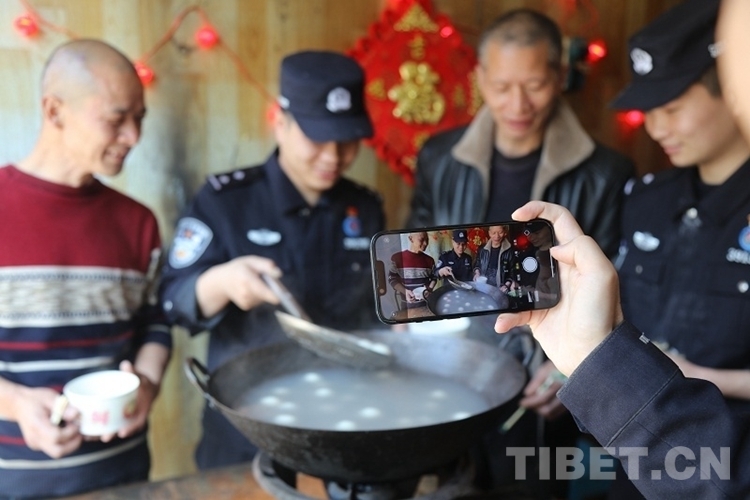 圖為民警為工人們盛湯圓,大家其樂融融 攝影:索朗次仁