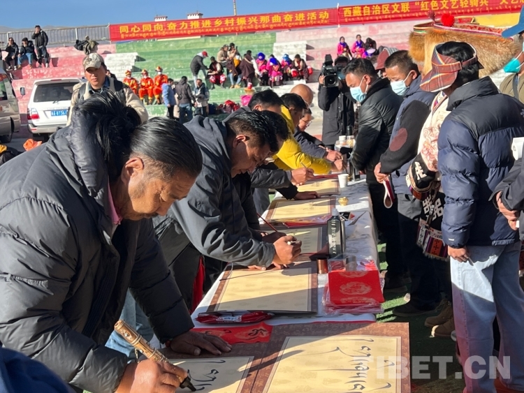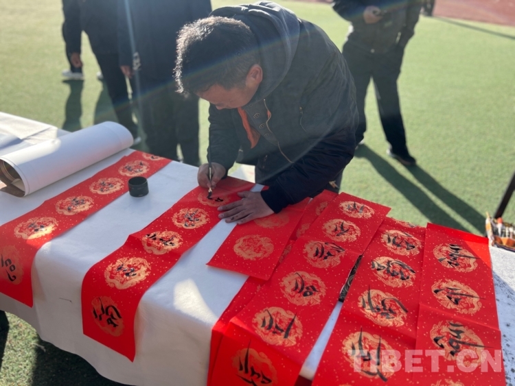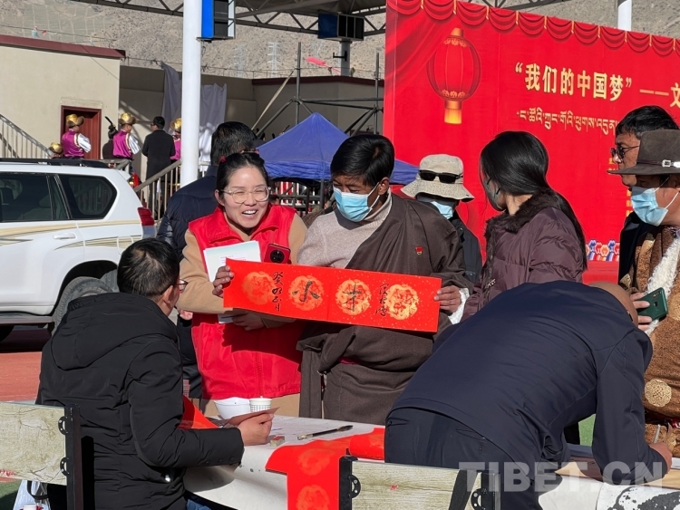 中國(guó)西藏網(wǎng)訊 2月16日,西藏自治區(qū)文聯(lián)主辦的“我們的中國(guó)夢(mèng)”——文化進(jìn)萬(wàn)家活動(dòng)在極高海拔生態(tài)搬遷安置點(diǎn)開(kāi)展。在送“書(shū)法”現(xiàn)場(chǎng),由西藏書(shū)法協(xié)會(huì)和山南市11位書(shū)法家為當(dāng)?shù)厝罕娝腿?00多張?jiān)⒁饷篮玫男履曜8:腿罕娖谕男履曜T傅??;顒?dòng)現(xiàn)場(chǎng)群眾絡(luò)繹不絕,大家心滿(mǎn)意足地拿著書(shū)法家為自己贈(zèng)送的精美“禮品”。一旁書(shū)法家們忙碌地為群眾書(shū)寫(xiě)祝詞,另一旁群眾們晾曬著他們得到的書(shū)法作品,一時(shí)間現(xiàn)場(chǎng)成了“書(shū)法展”,時(shí)不時(shí)地有人前來(lái)參觀欣賞。(中國(guó)西藏網(wǎng) 記者/德吉卓瑪)