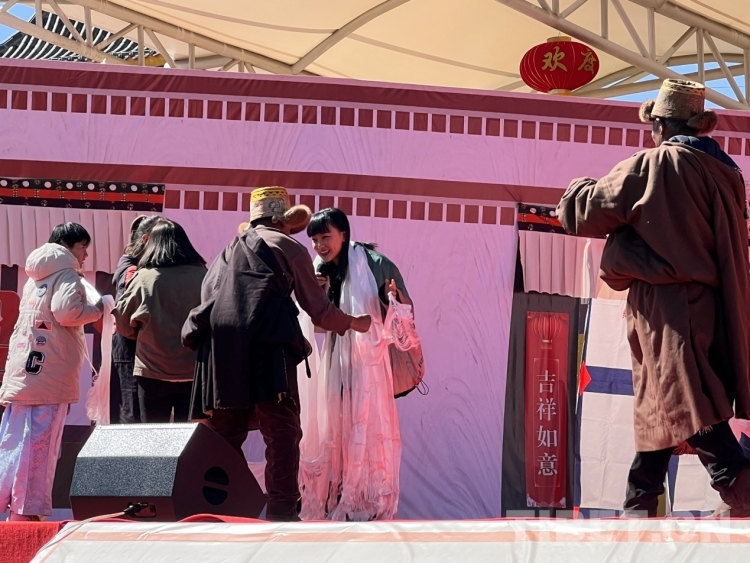 圖為當?shù)厝罕姙榍嗄旮枋贮S齡獻哈達 攝影:次旦拉姆