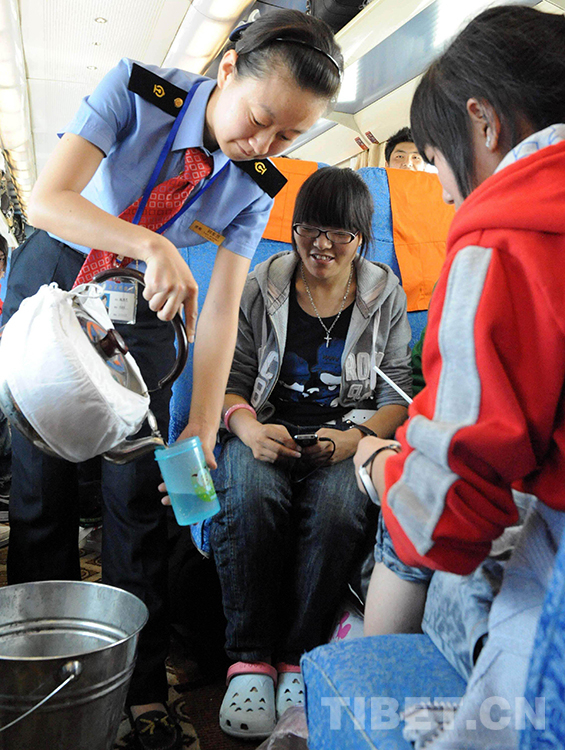 這是被藏族旅客稱為“格?;ā钡木┎剀囮犎M乘務(wù)員魏若思在唐古拉山段為旅客送水(唐召明2010年7月4日攝)