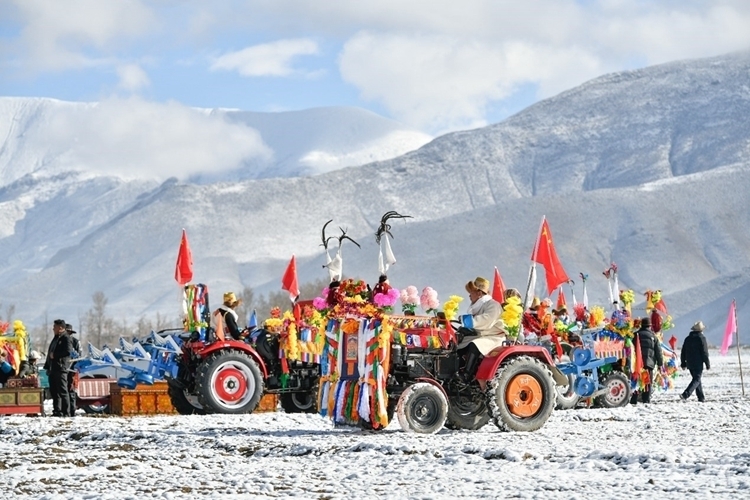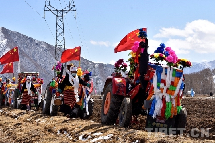 在雪水浸潤(rùn)過的肥沃土地上,深耕機(jī)車輪翻滾而過,駛過的土地上翻起深色的泥土,婦女們跟在后面播撒青稞良種。