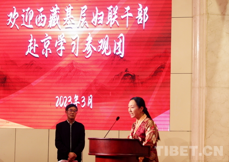 圖為西藏自治區(qū)婦聯(lián)黨組成員、副主席澤仁卓嘎(右一)在北京建藏援藏工作者協(xié)會在北京西藏大廈為“2023年西藏基層?jì)D聯(lián)干部赴京學(xué)習(xí)參觀團(tuán)”成員們舉行的歡迎會上發(fā)言 攝影:劉莉