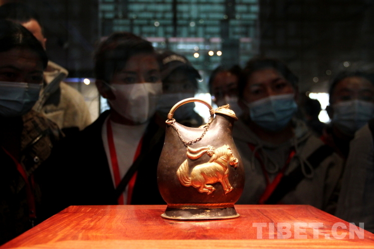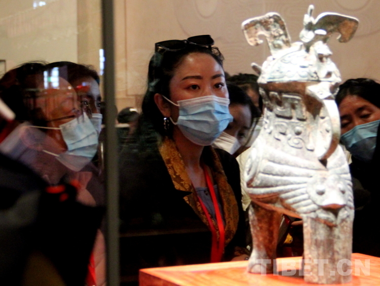圖為2023年西藏基層?jì)D聯(lián)干部赴京學(xué)習(xí)參觀團(tuán)成員們在中國工藝美術(shù)館·中國非物質(zhì)文化遺產(chǎn)館內(nèi)欣賞唐代文物鎏金舞馬銜杯紋銀壺的復(fù)制件 攝影:劉莉