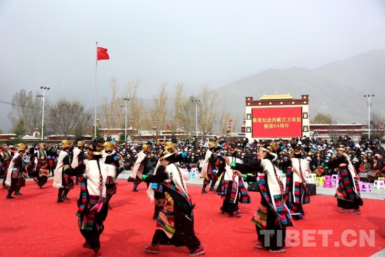 圖為各界代表和克松群眾慶祝西藏百萬(wàn)農(nóng)奴解放64周年 攝影:王佳豪