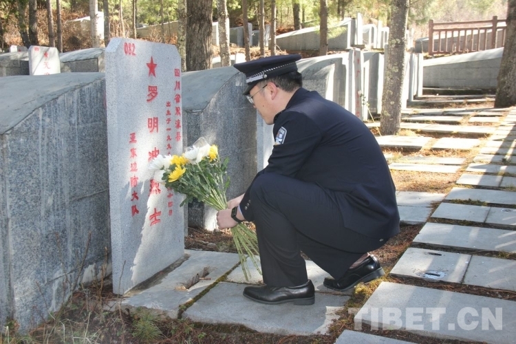 圖為西藏邊檢總站執(zhí)法調(diào)查支隊(duì)執(zhí)法調(diào)查七隊(duì)民警向烈士敬獻(xiàn)鮮花 攝影:李渠成