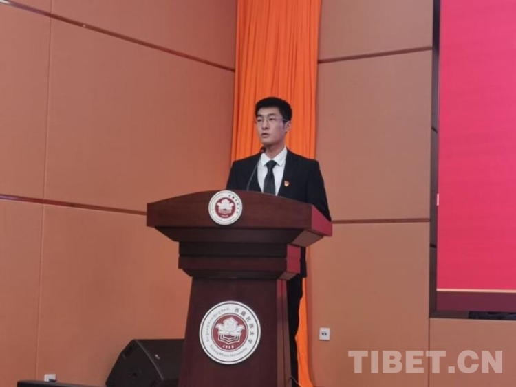 圖為劉陽作為學生代表在西藏民族大學演講