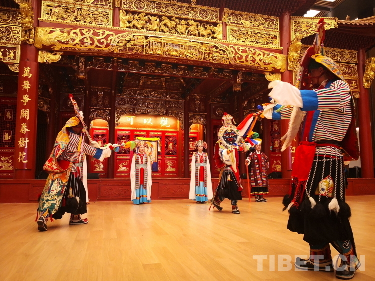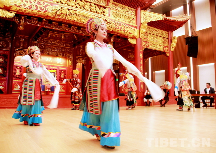 圖為西藏自治區(qū)拉薩市城關區(qū)娘熱民間藝術團的藝術家們在“戲舞雪域——多元文化視野中的藏戲藝術推廣研討會”上表演藏戲開場《溫巴頓》片段 攝影:劉莉