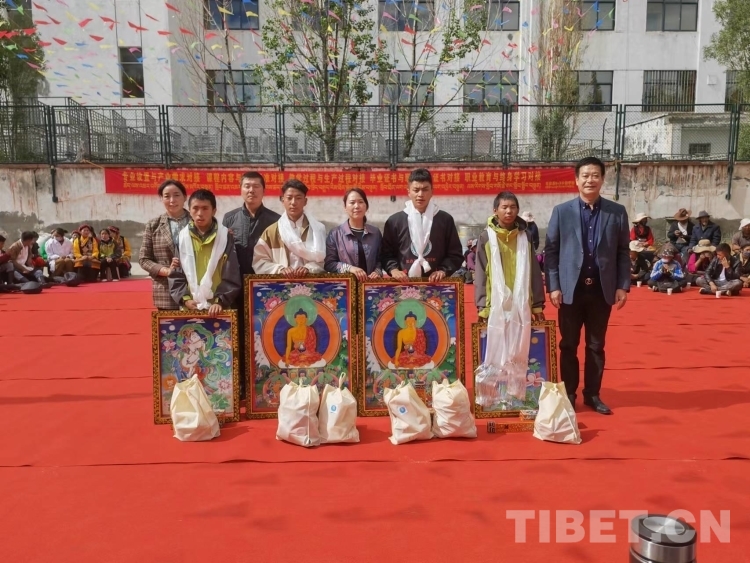 圖為學(xué)校為唐卡專業(yè)的學(xué)生贈送自己的唐卡作品和繪畫工具及顏料等