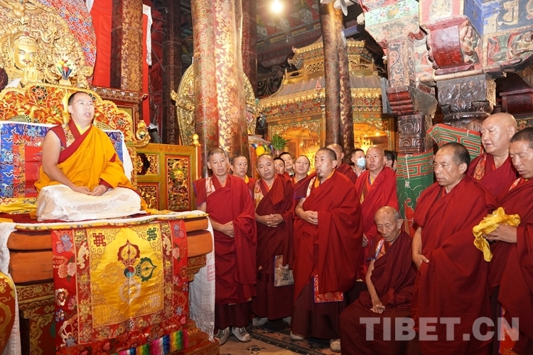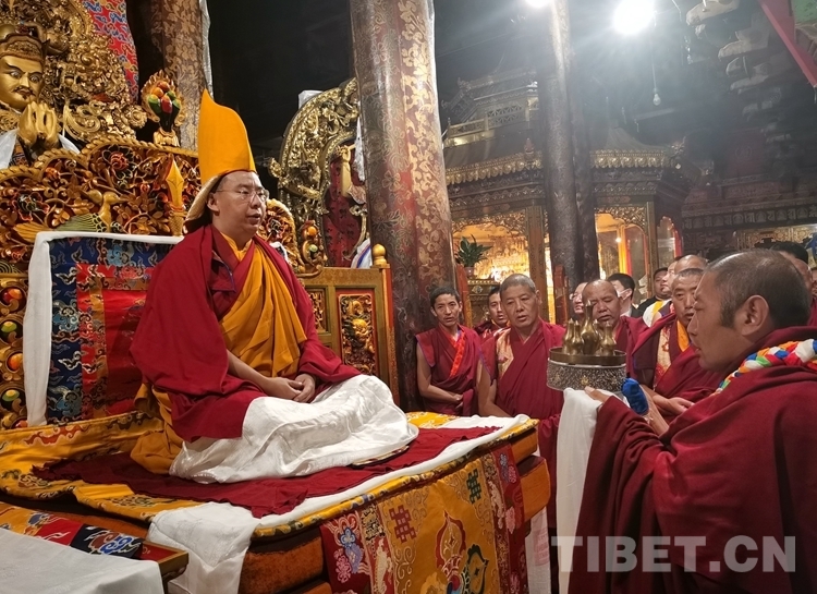 中國西藏網(wǎng)訊 6月25日凌晨,全國政協(xié)常委、中國佛教協(xié)會副會長、中國佛教協(xié)會西藏分會會長班禪額爾德尼·確吉杰布在拉薩大昭寺朝拜釋迦牟尼佛像,并為大昭寺僧眾摸頂賜福。