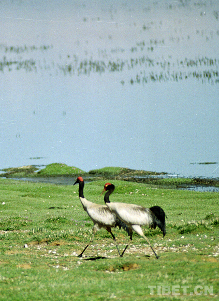 在藏北草原上漫步的國家一級(jí)保護(hù)動(dòng)物、被稱為”鳥類熊貓“的黑頸鶴(唐召明2001年攝)