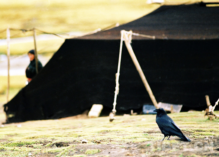 在雙湖辦事處北措折鄉(xiāng)(現(xiàn)雙湖縣措折強(qiáng)瑪鄉(xiāng))一帳篷前,一只烏鴉在漫步(唐召明2001年攝)