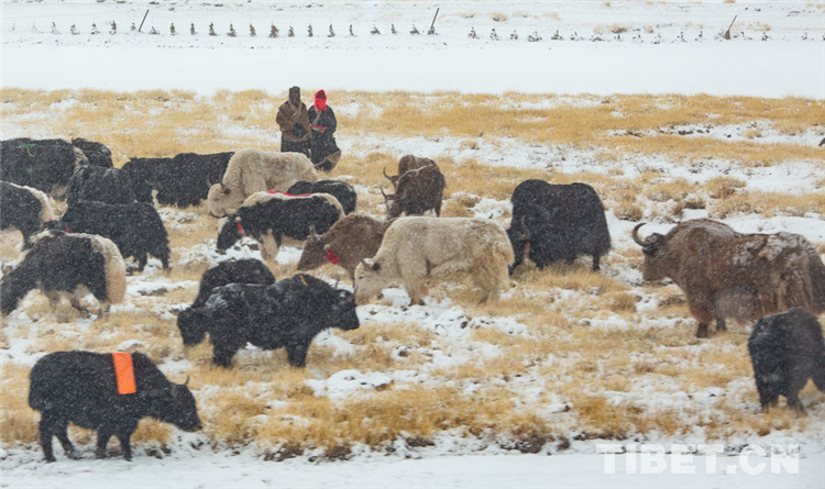 資料圖:雪中牧民群眾驅(qū)趕牦牛群回家