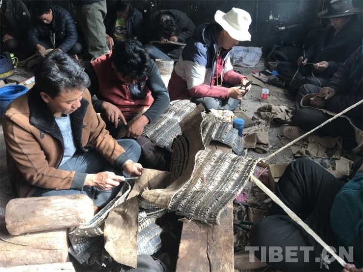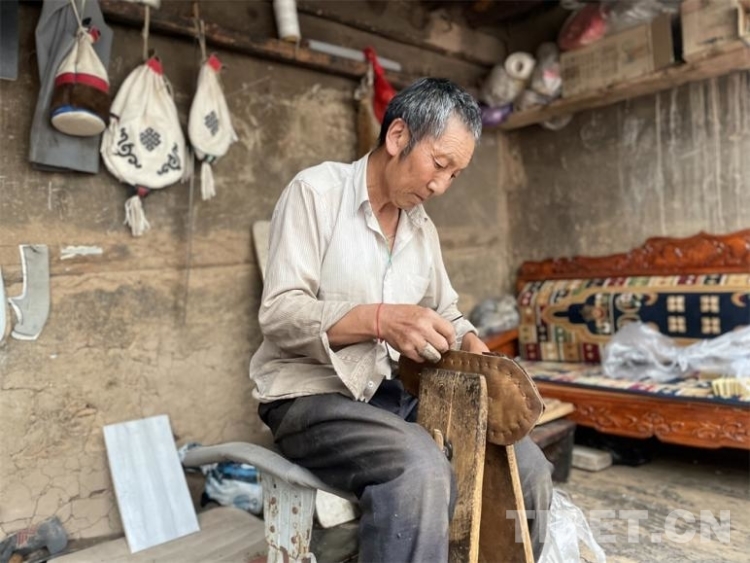 圖為制靴匠人仁青江措正在手工制作
