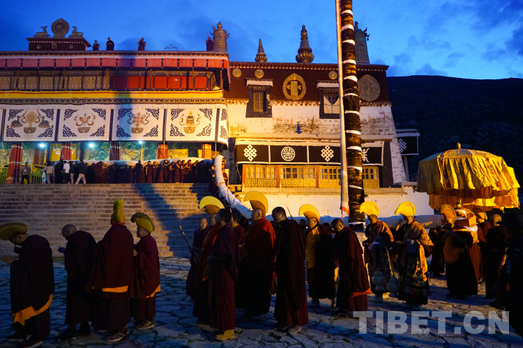 天還未亮,在哲蚌寺措欽大殿內,僧人們已早早準備,做好展佛前的各項工作。伴隨著措欽大殿內低沉的誦經聲、大殿外長鳴的法號和齊響的法螺,許多青壯年僧人將巨幅唐卡卷軸呈蛇形緩緩抬出大殿,朝著哲蚌寺后山前進,不少群眾主動加入,共同參與這一時刻。