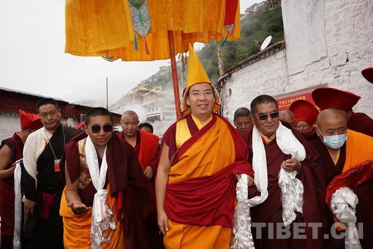 當(dāng)日11時許,在眾僧的期盼中,班禪一行抵達直孔替寺。頓時,現(xiàn)場法號齊鳴、法螺合奏,直孔瓊倉·洛桑強巴活佛和僧眾在寺廟前舉行了隆重的歡迎儀式。