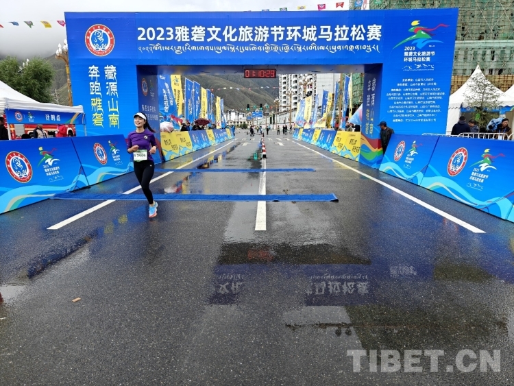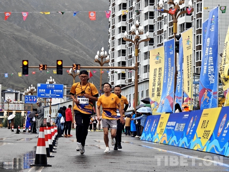 圖為競速跑11公里男子組第一名格桑旺堆抵達(dá)終點 攝影:次旦拉姆