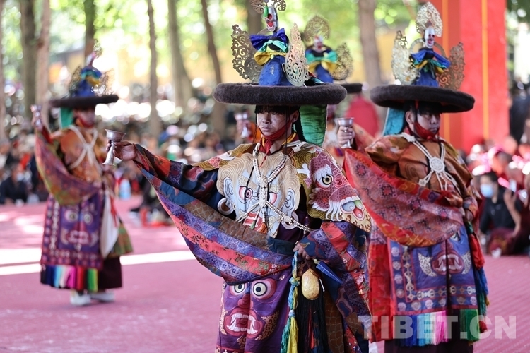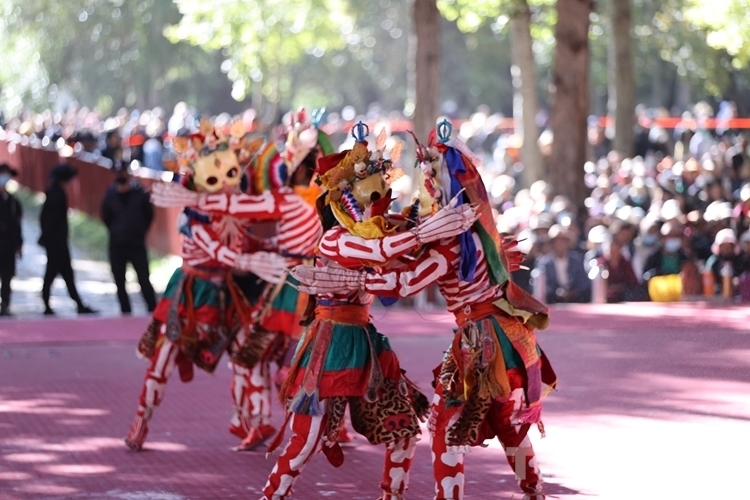 當渾厚悠遠的法號、法螺聲在大院內外回旋開來,“羌姆”表演正式拉開帷幕。期間,僧人頭戴面具,身穿戲裝,手持鼓刀斧等道具,逐次表演金剛、骷髏、鹿牛、比丘、鴉鴟、六長壽等數(shù)十節(jié)神舞,氣氛莊重而神秘。