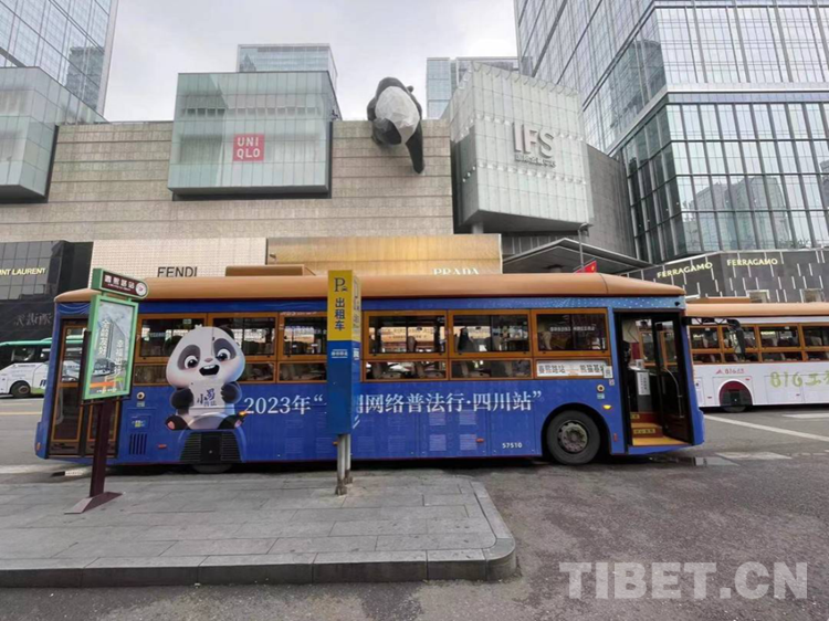 圖為成都網紅地標“熊貓爬墻”旁邊的“網絡普法公交車”
