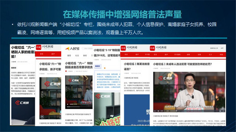 “全國網絡普法行?四川站”活動啟動儀式上,四川省公安廳、成都市檢察院、四川省未成年人網絡保護促進會等單位代表進行了網絡普法經驗分享,通過交流、學習推動網絡普法工作開展。