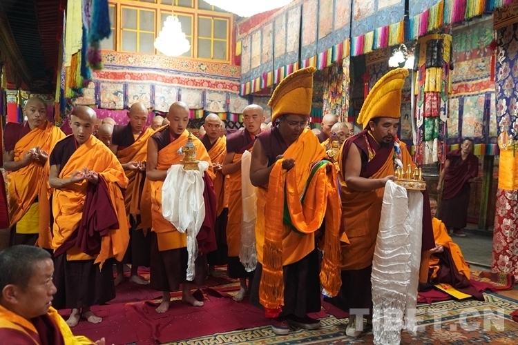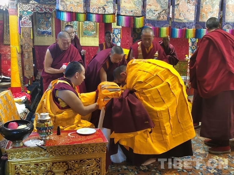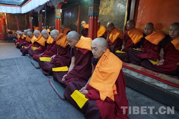 當(dāng)天清晨,扎什倫布寺桑煙繚繞、法號(hào)聲聲,28 位受戒的年輕僧人帶著新制袈裟,迎著朝霞依次走向拉讓殿等待班禪授戒這一神圣時(shí)刻的到來。8時(shí)許,在手持黃傘、香爐和吹嗩吶的高僧護(hù)送引領(lǐng)下班禪緩緩步入拉讓殿,并與在場(chǎng)僧眾集體誦經(jīng)。誦經(jīng)儀式結(jié)束后,班禪就坐于拉讓殿寶座,4名高僧大德作為授戒眾,開始為僧人閉門授戒、剃度、賜法名、摸頂。此時(shí),受戒僧人一一入座,兩手在胸前交叉,聽班禪引證經(jīng)典告誡,并宣誓嚴(yán)守戒律。