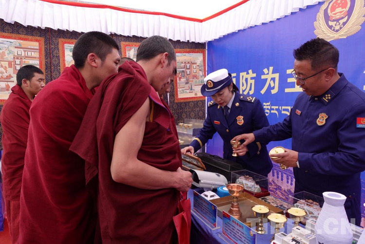 圖為啟動(dòng)儀式現(xiàn)場(chǎng)拉薩消防指戰(zhàn)員向僧人科普日常寺廟消防安全知識(shí)