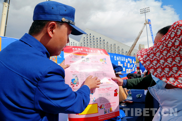 圖為啟動(dòng)儀式現(xiàn)場(chǎng)拉薩消防指戰(zhàn)員向市民科普日常消防安全知識(shí)