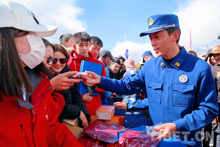 圖為啟動(dòng)儀式現(xiàn)場(chǎng)拉薩消防指戰(zhàn)員向市民發(fā)放文創(chuàng)產(chǎn)品和宣傳資料