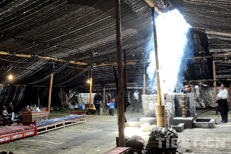在那曲賽馬盛會上供游人參觀的“巴拿扎西林杰大黑帳”內景。這頂大“黑帳”占地面積3600平方米、內部有效面積666平方米,可供上百人自由活動(唐召明2009年8月12日攝)