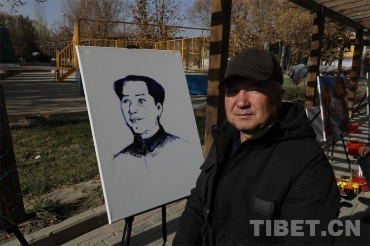 來(lái)到作畫區(qū)域,首先吸引記者注意的便是身穿黑衣、頭戴灰帽的西爾艾力·艾買提老人。在雪白的畫布前,老人用藍(lán)色和墨色顏料深淺描繪,勾勒出我們最熟悉的面孔。他向我們介紹說:“我畫的是我們偉大的毛主席年輕時(shí)候。沒有毛主席,我們中國(guó)人的生活不是這個(gè)樣子的,我很感恩他。我畫毛主席就是想讓更多人看見,讓他的故事得到更好的緬懷?!?/span>