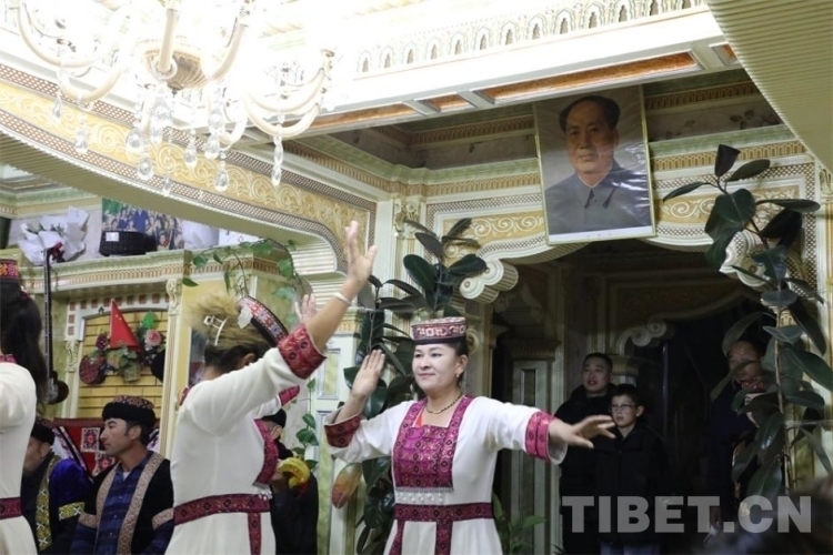 一路前行,在喀什地區(qū)澤普縣的布依魯克塔吉克風(fēng)情小鎮(zhèn),美輪美奐的獨(dú)棟小院是小鎮(zhèn)居民區(qū)的特色,在夕陽(yáng)的映襯下顯得格外溫馨舒適。好客的塔吉克族老人巴哈爾古麗·熱扎熱情地邀請(qǐng)走訪團(tuán)一行前往家里做客。穿過小院,一進(jìn)客廳就看見門廳上方懸掛著的毛主席畫像。當(dāng)所有人落座后,鷹笛聲響起,身穿塔吉克民族服飾的人們開始翩翩起舞,充滿了載歌載舞的歡樂氣氛。