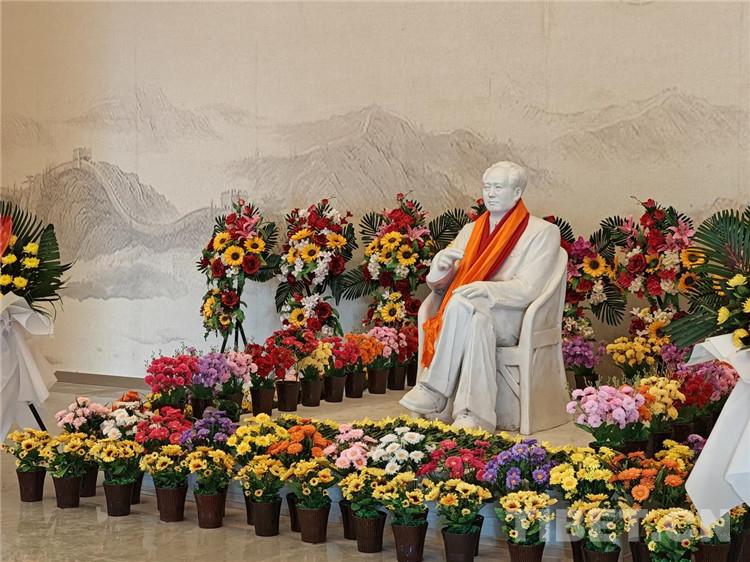 圖為參加活動的西藏各族群眾代表向毛澤東雕像敬獻(xiàn)鮮花