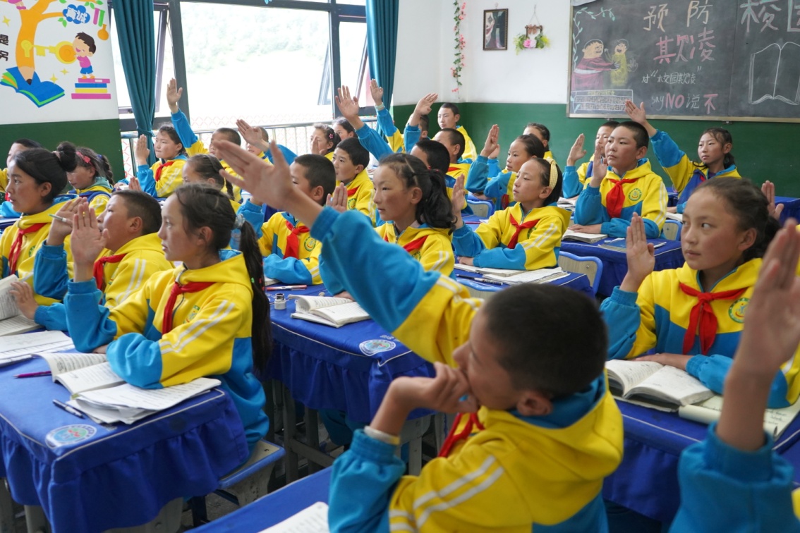 圖為西昌鄉(xiāng)小學學生在課堂上舉手回答問題 攝影:吳建穎