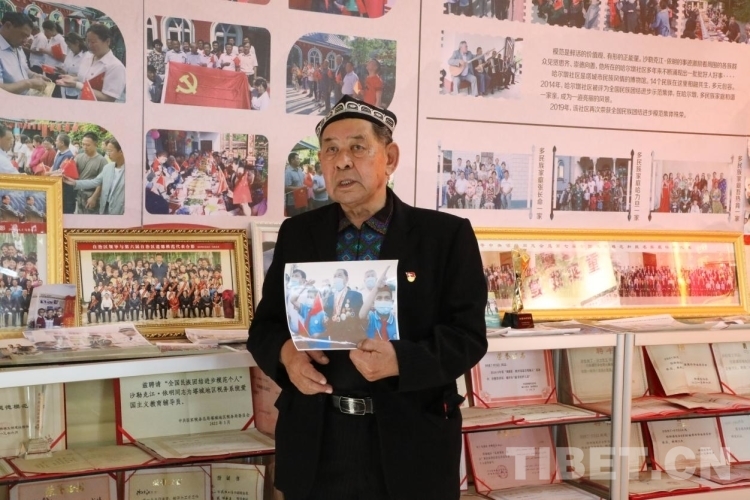 在講述故事的時候,沙勒克江·依明老人總是把腰背挺得直直的,雙眼的目光有神而堅定,說話吐詞帶有重音和落地實感。當他拿起照片,講起自己觀看天安門廣場的升旗儀式時,他會用腳一聲一聲地踏出聲音,沉浸描述當時國旗班的腳步聲帶給他的心靈震撼。而隨著他的動作,我們的身心也顫抖了起來。