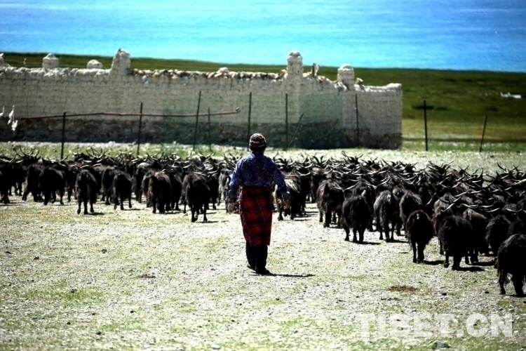 資料圖:阿里地區(qū)措勤縣牧民驅趕著紫絨山羊群前往扎日南木錯湖邊