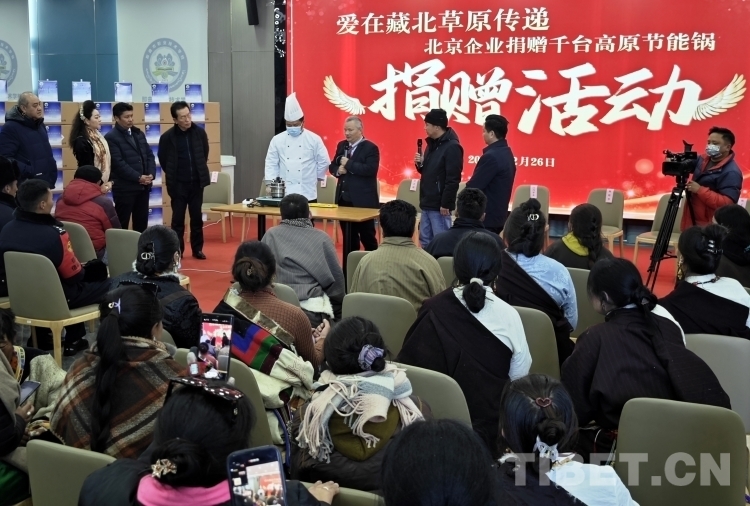 隆冬時節(jié),藏北大地千里雪飄,寒氣襲人,但在那曲市職業(yè)學校實訓樓里卻熱鬧非凡。室內(nèi),大型電子屏顯示著“愛在藏北草原傳遞——北京企業(yè)捐贈千臺高原節(jié)能鍋捐贈活動”的字幕。那曲市近百名農(nóng)牧民群眾和環(huán)衛(wèi)工人、鐵路護路隊員代表相聚這里接受捐贈。