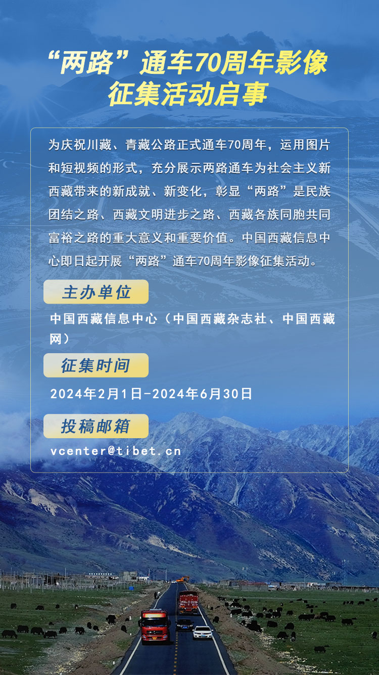 為慶祝川藏、青藏公路正式通車70周年,運用圖片和短視頻的形式,充分展示兩路通車為社會主義新西藏帶來的新成就、新變化,彰顯“兩路”是民族團結之路、西藏文明進步之路、西藏各族同胞共同富裕之路的重大意義和重要價值。中國西藏信息中心即日起開展“兩路”通車70周年影像征集活動。