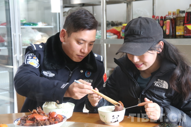 氧氣瓶、高原藥品、熱水......接德吉永措的車上已準(zhǔn)備好了各種抗高反和取暖的東西,這讓她提前感受到了來自丈夫單位的熱情與關(guān)懷。與愛人相聚后,旦增洛追帶著妻子參觀營區(qū),迫切地想讓她了解他用青春為之奮斗的警營,隨后他又帶著妻子到單位食堂品嘗自己親自下廚做的紅燒肉?!班牛∥兜篮芎??!钡录来氤灾煞蚪o她夾的肉,臉上洋溢著幸福的笑容。