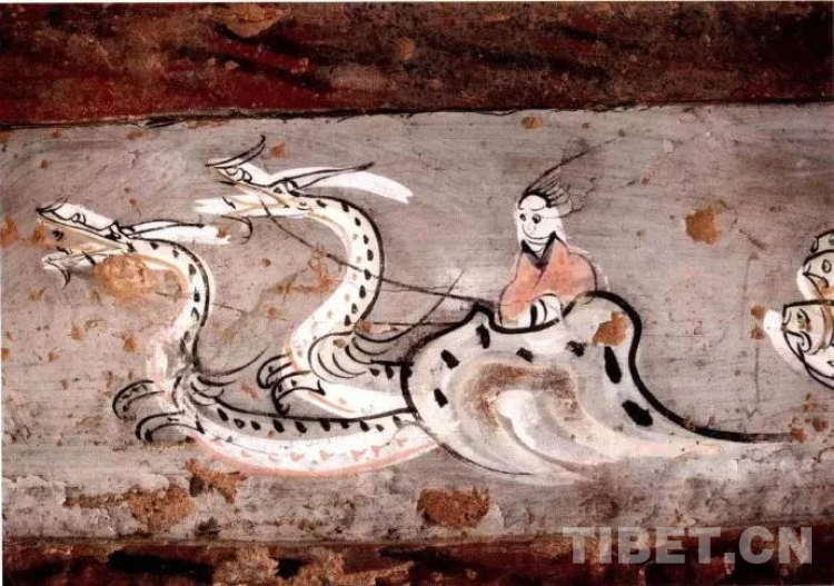圖為陜西靖邊縣郝灘漢墓壁畫:駕雙龍之車遨游天國圖,距今約2000年。