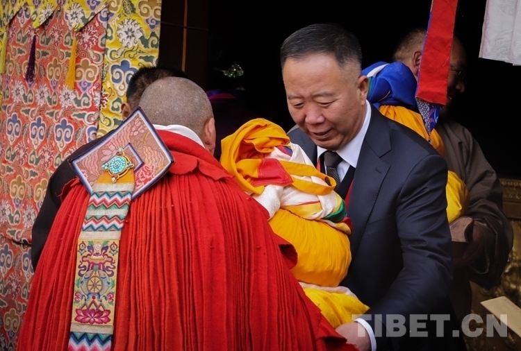 圖為西藏自治區(qū)政府副秘書長高寶軍向獲得學(xué)位的考僧贈送五彩緞、干果、袈裟 攝影:賈華加